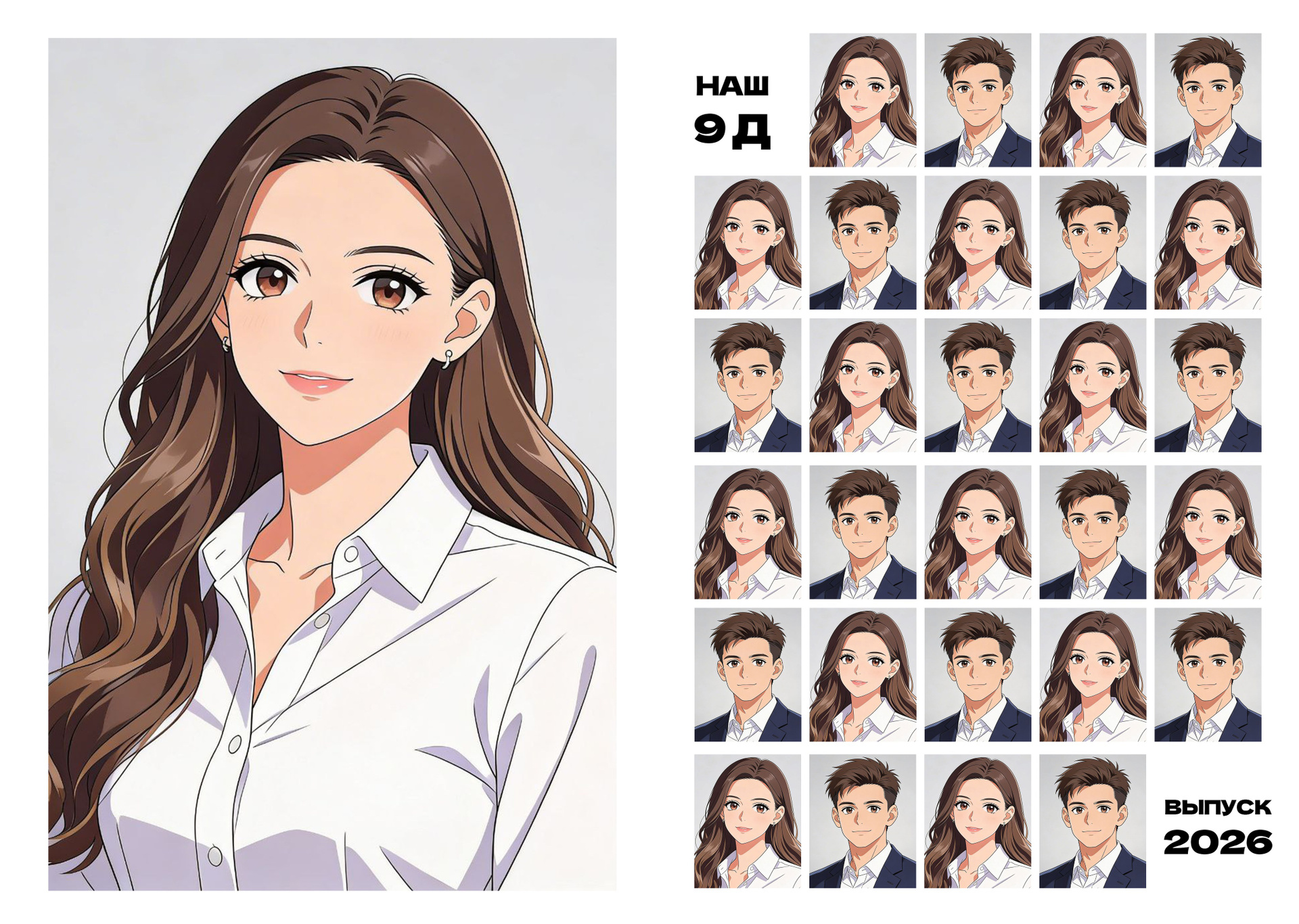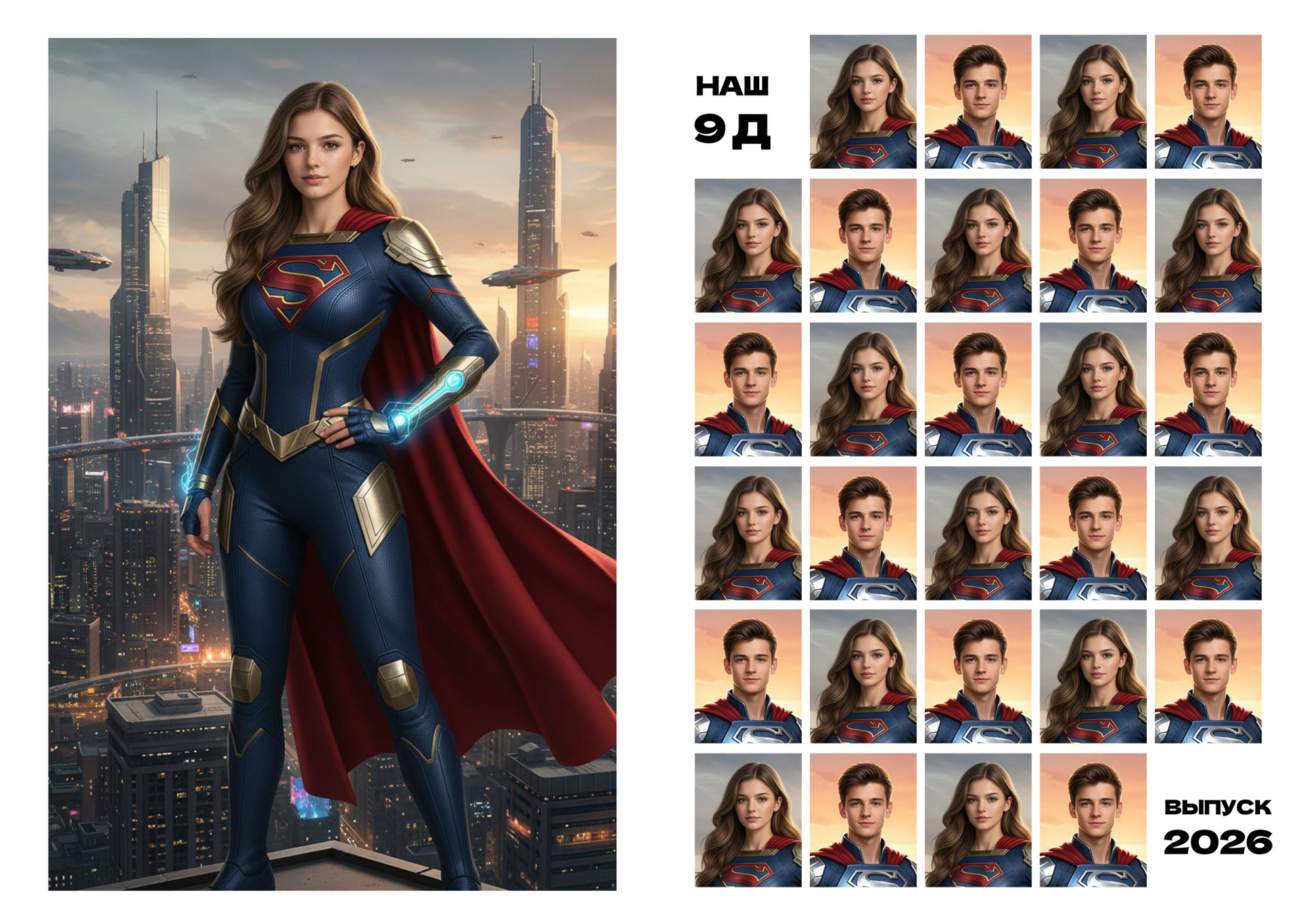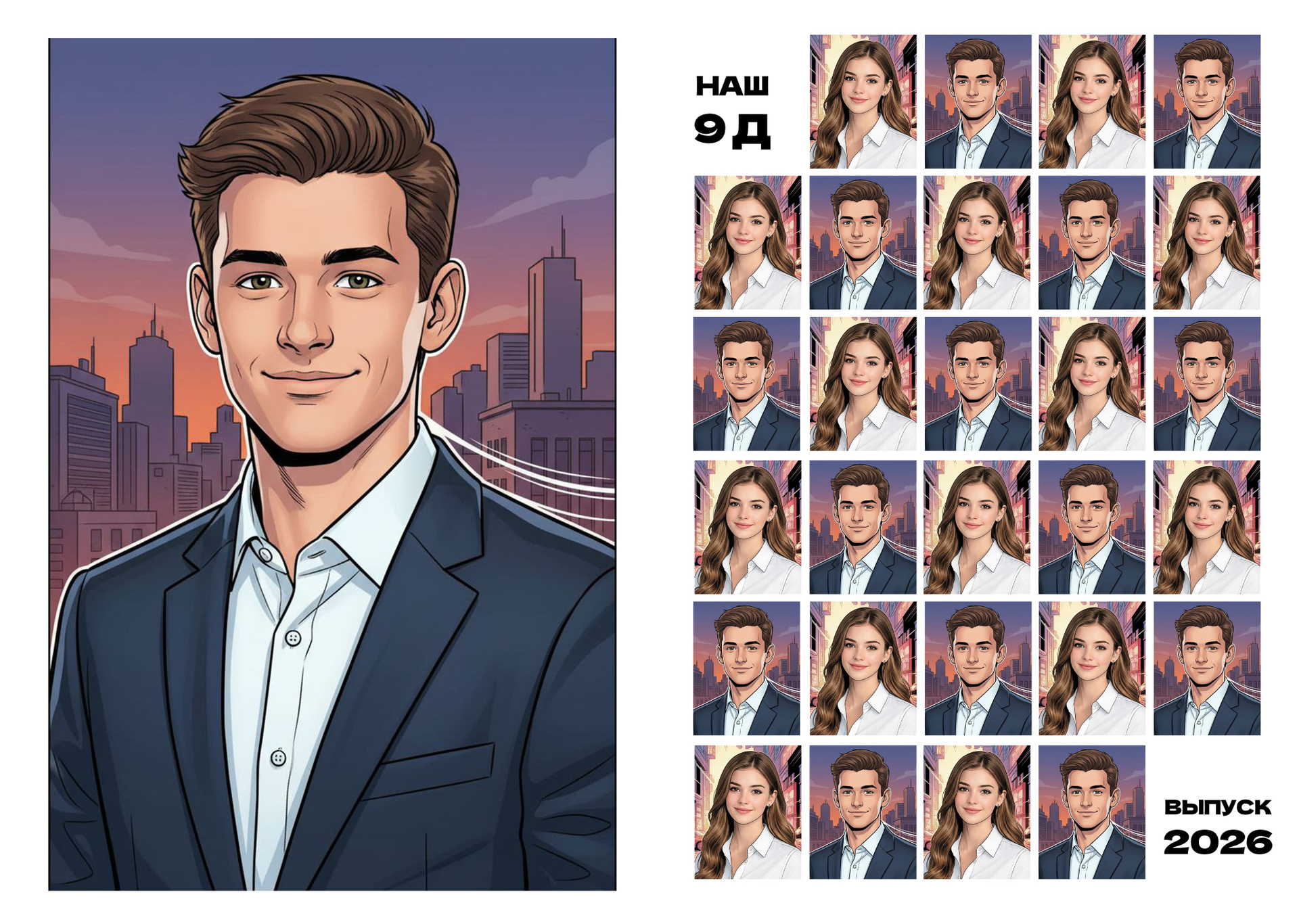Добавь в свой альбом разворот с изображениями, созданными с помощью искусственного интеллекта на основе ваших классных фотографий от нашего фотографа, чтобы внести элемент неожиданности и «вау-эффект».